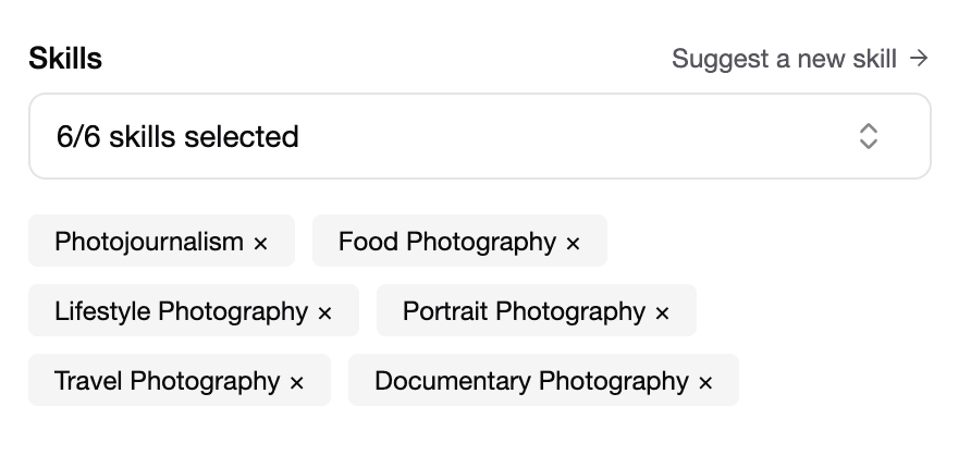 Choose the category that best represents what you actually want to be hired for. Most creatives can do a bit of everything, but this is your chance to lead with your strongest skillset. Same goes for your listed skills - pick the ones you’re genuinely great at and want to keep doing more of. That’s how the right clients will find you.